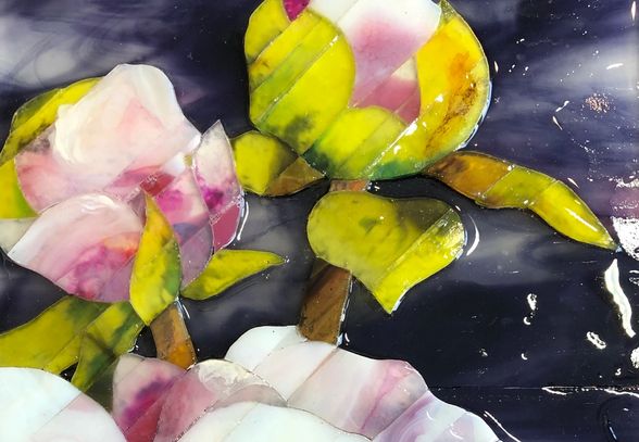 Her glass art paintings are created one piece at a time. Using tools that glass artists have used for centuries, she hand-cuts the glass into long thin strips of various widths. These strips of glass become her palette. With meticulous precision, and NOT fused, she shapes them and places them side-by-side, building colors and textures similar to a painter with brushstrokes.
