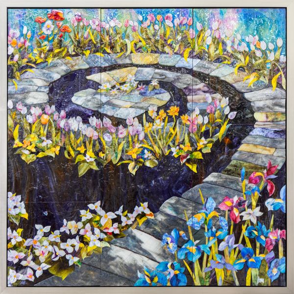 With One Another is a glass art painting that was inspired by a garden of iris.